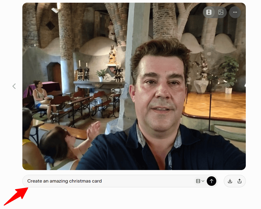 Esta es la imagen que hemos subido, tomada en el verano pasado en la Colonia Güell, y le pedimos que nos haga un vídeo a partir de un post tan simple como pedirle que nos cree una «tarjeta navideña espectacular» (escrito en inglés).