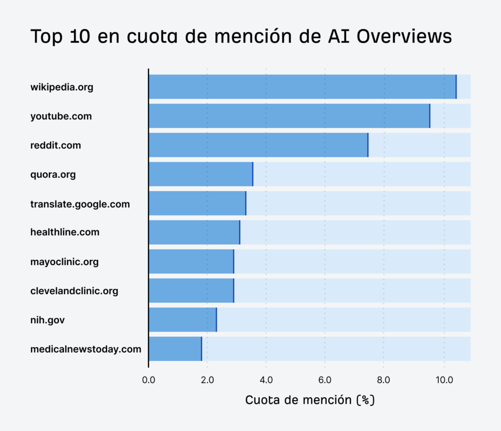 3) Reddit y Quora ocupan un lugar destacado solo en AI Overviews (7,4% y 3,6%). No entran en el top 10 de Perplexity o ChatGPT. Esto último difiere de los resultados que veremos en los siguientes estudios donde Reddit está en primera o segunda posición.