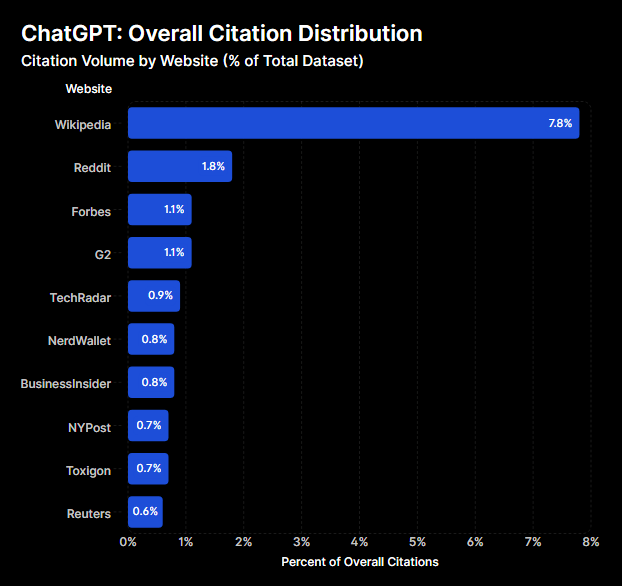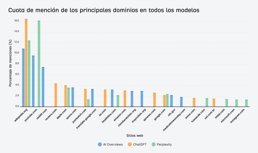 1) Wikipedia: Wikipedia domina en los tres, pero ChatGPT (16,3%) es el que más lo cita, seguido de Perplexity (12,5%) y luego AI Overviews (8,4%).