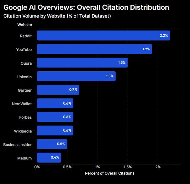 2) Google AI Overviews: Las fuentes más citadas en su AI Overviews incluyen LinkedIn, YouTube, Reddit y dominios propiedad de Google o aliados estratégicos, como Google y Google Blog.